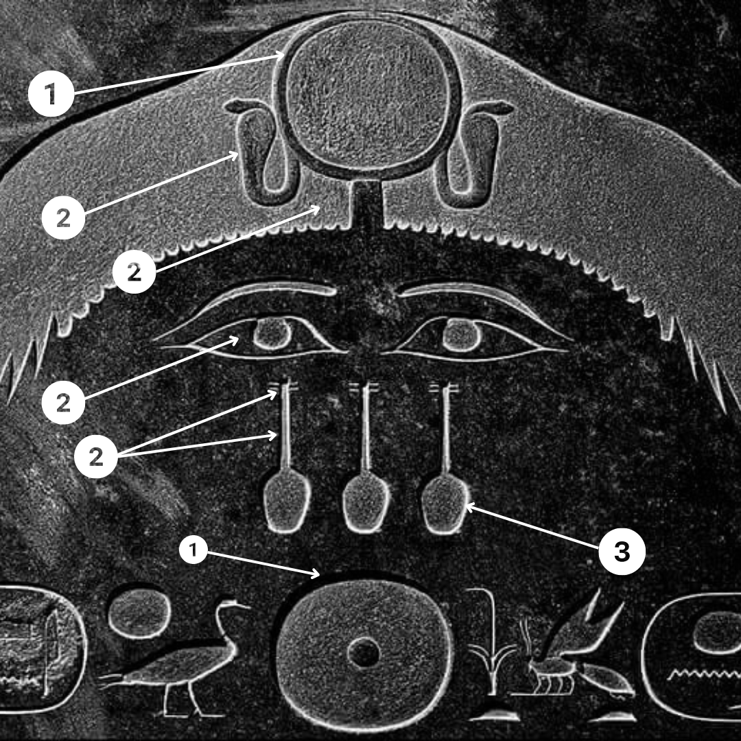 God, the number one and the circle are directly connected. The capstone art starts with a circle on top representing the birth of the universe(God, universal first cause, big bang). The circle is also at the bottom and in between there are two hieroglyphs depicting two animals facing each other symbolizing Duality.